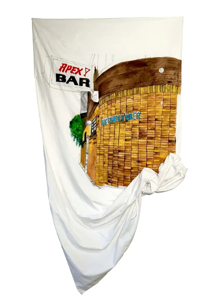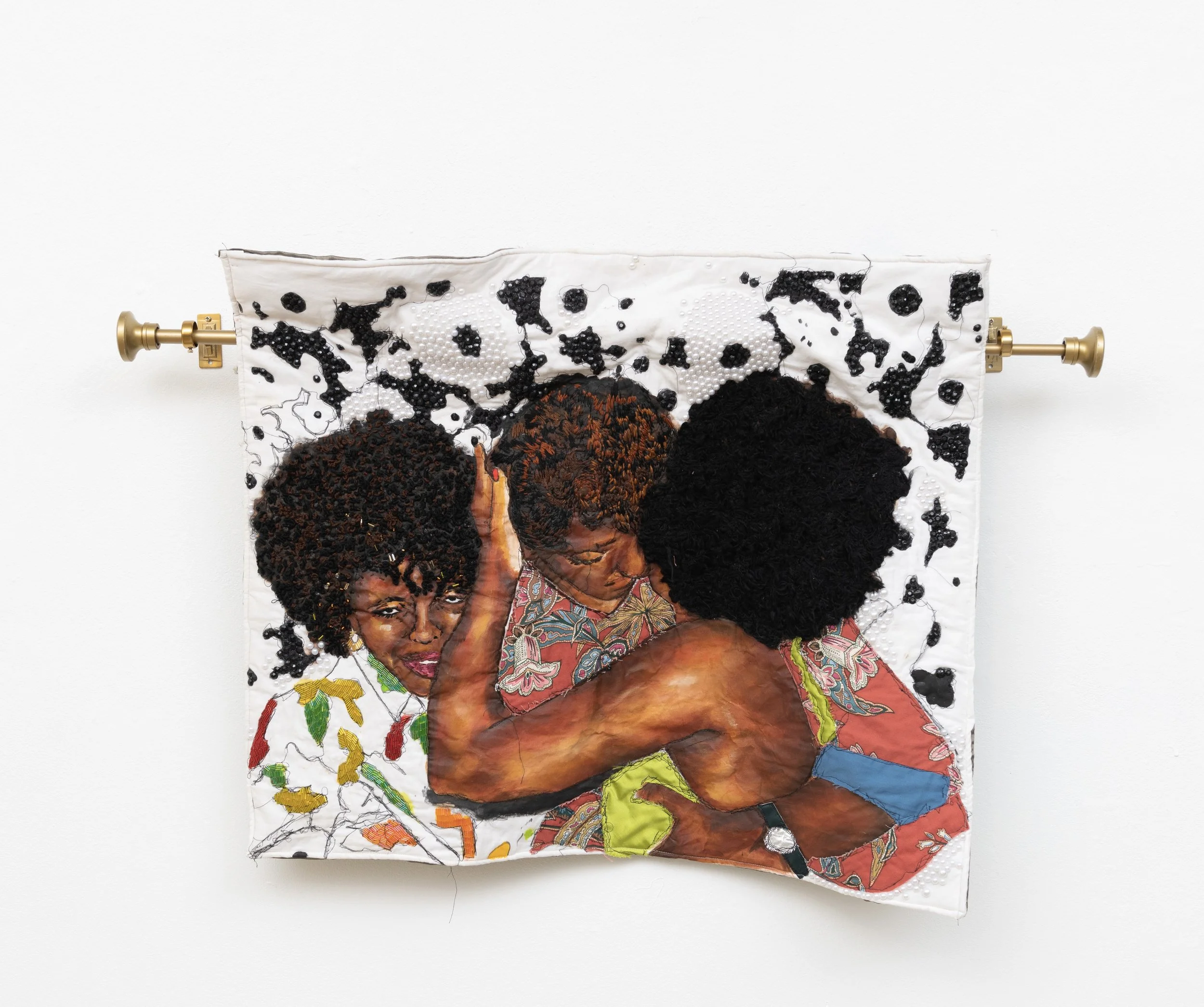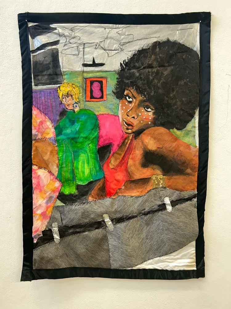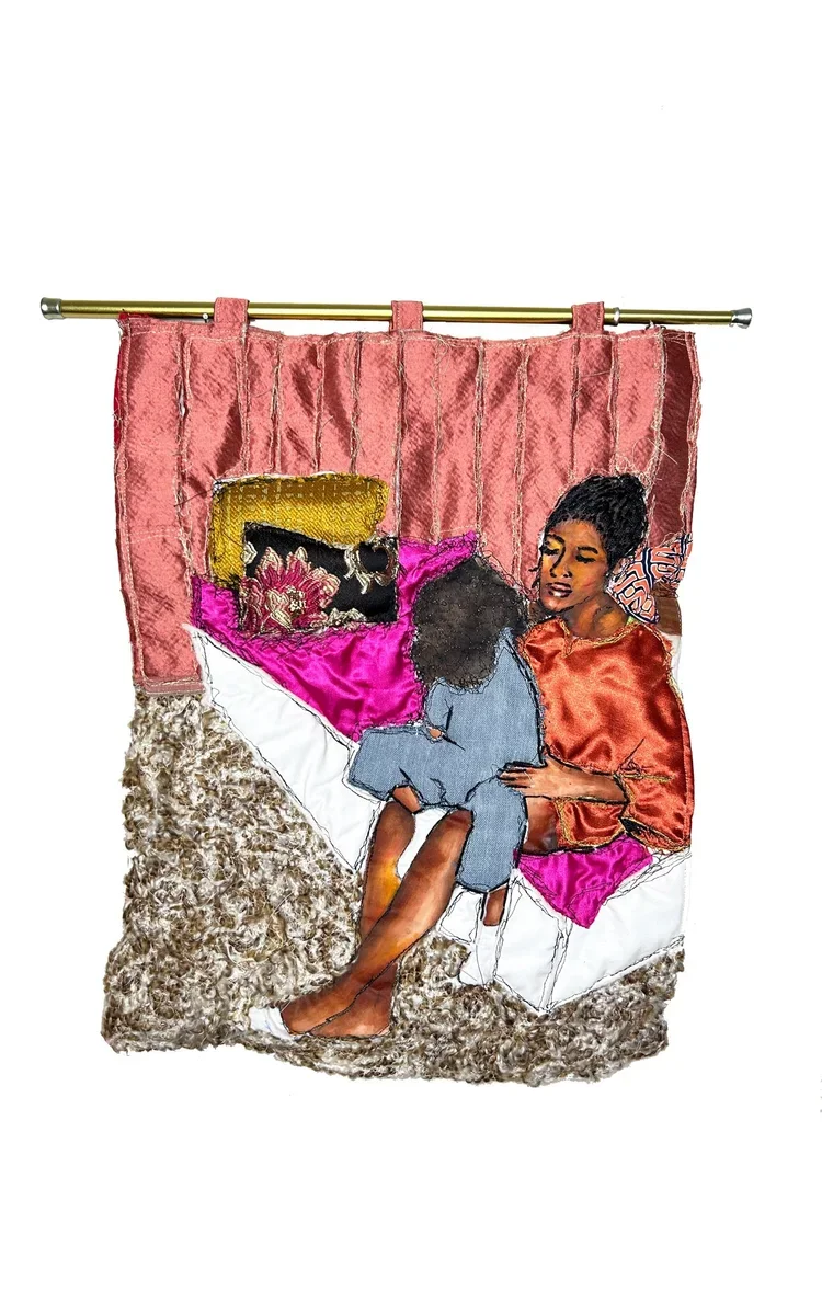 Medium: Acrylic Paint, Thread, Assortment of Vintage Fabrics, curtain rod, cotton.