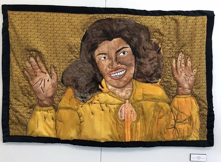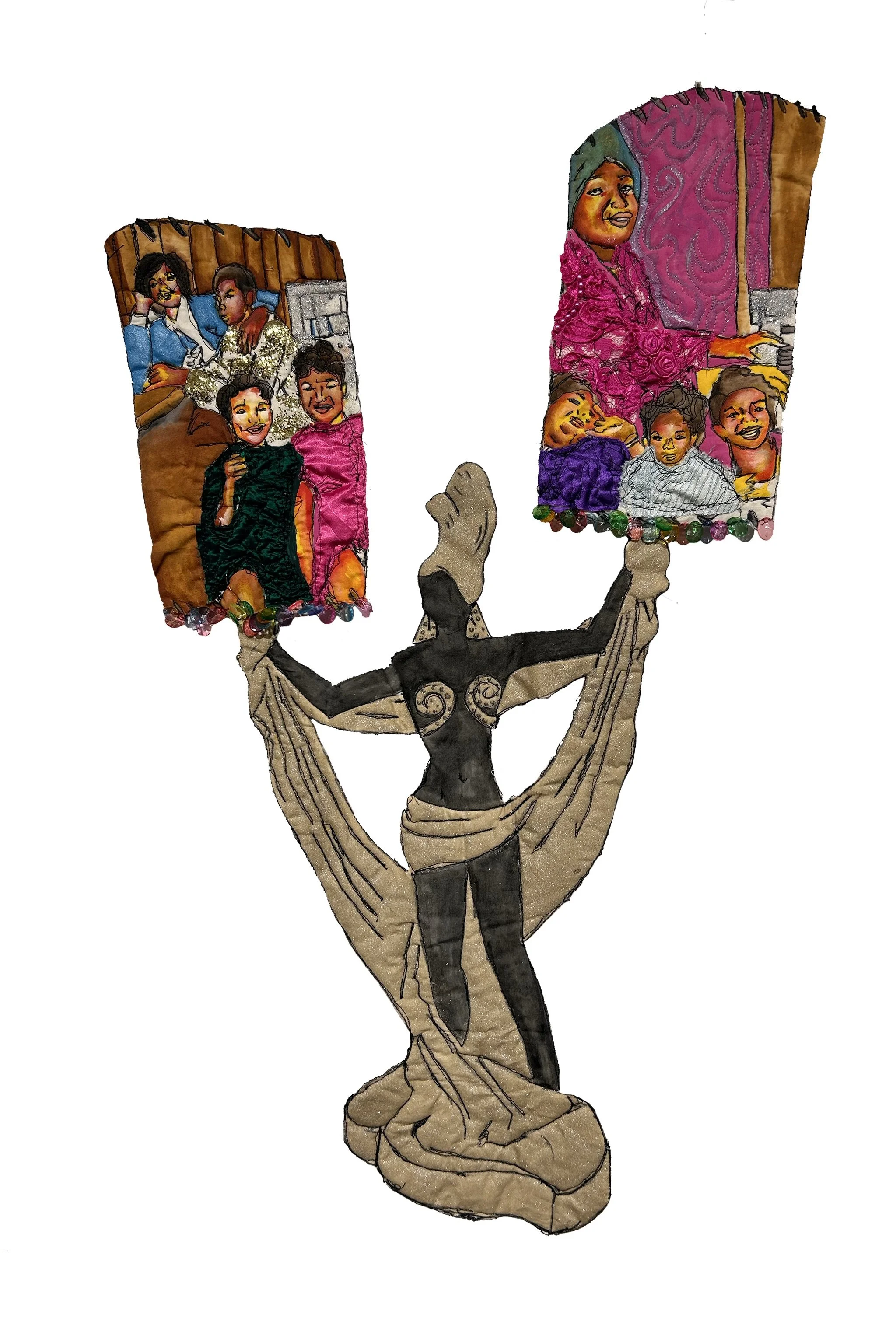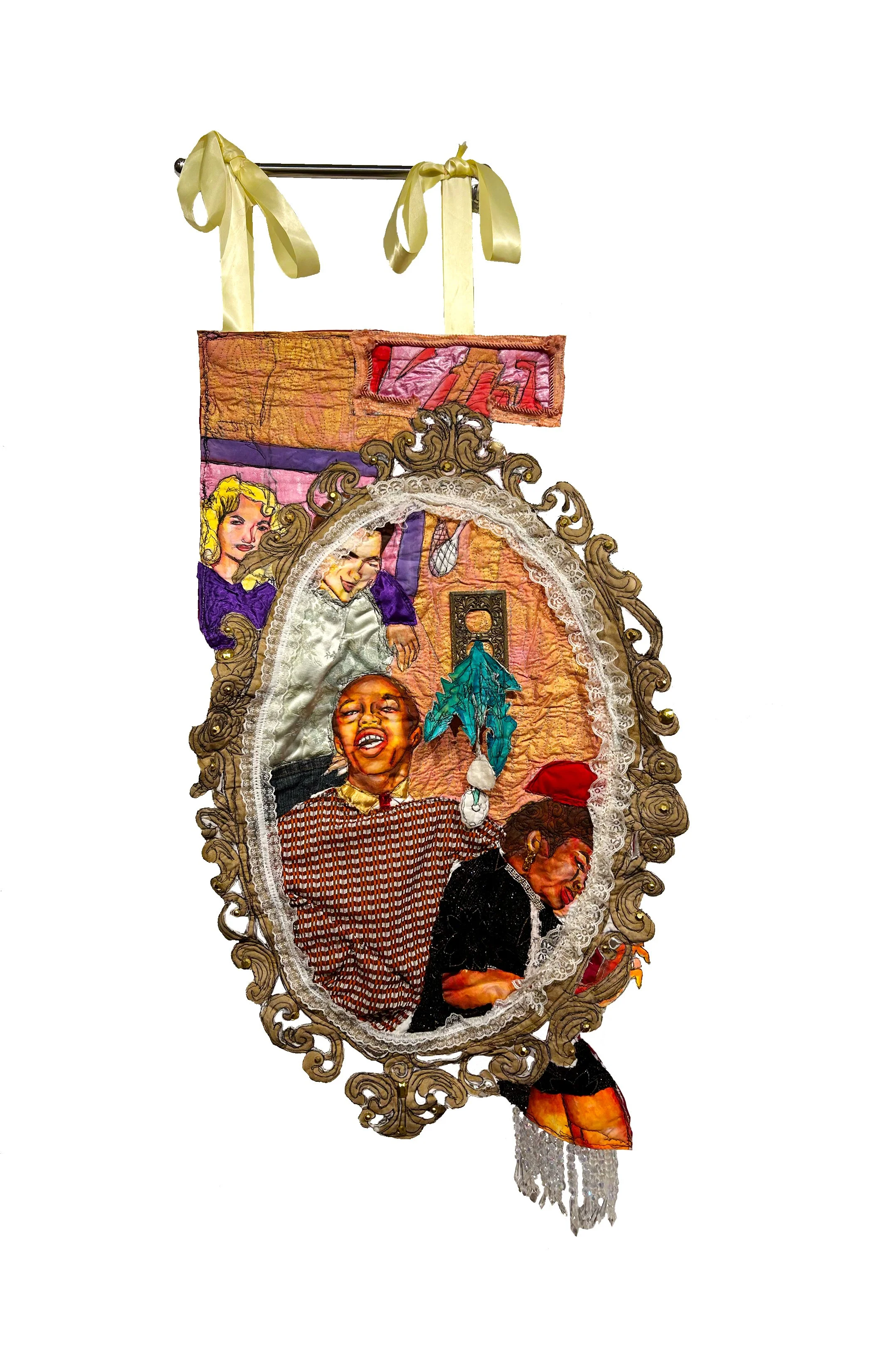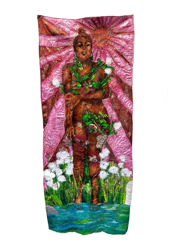 Medium: Vinyl, Acrylic Paint, Thread, Assortment of Vintage Fabrics, Plummers Rod, Gold Leaf, Glitter Cotton, Glass Beads.