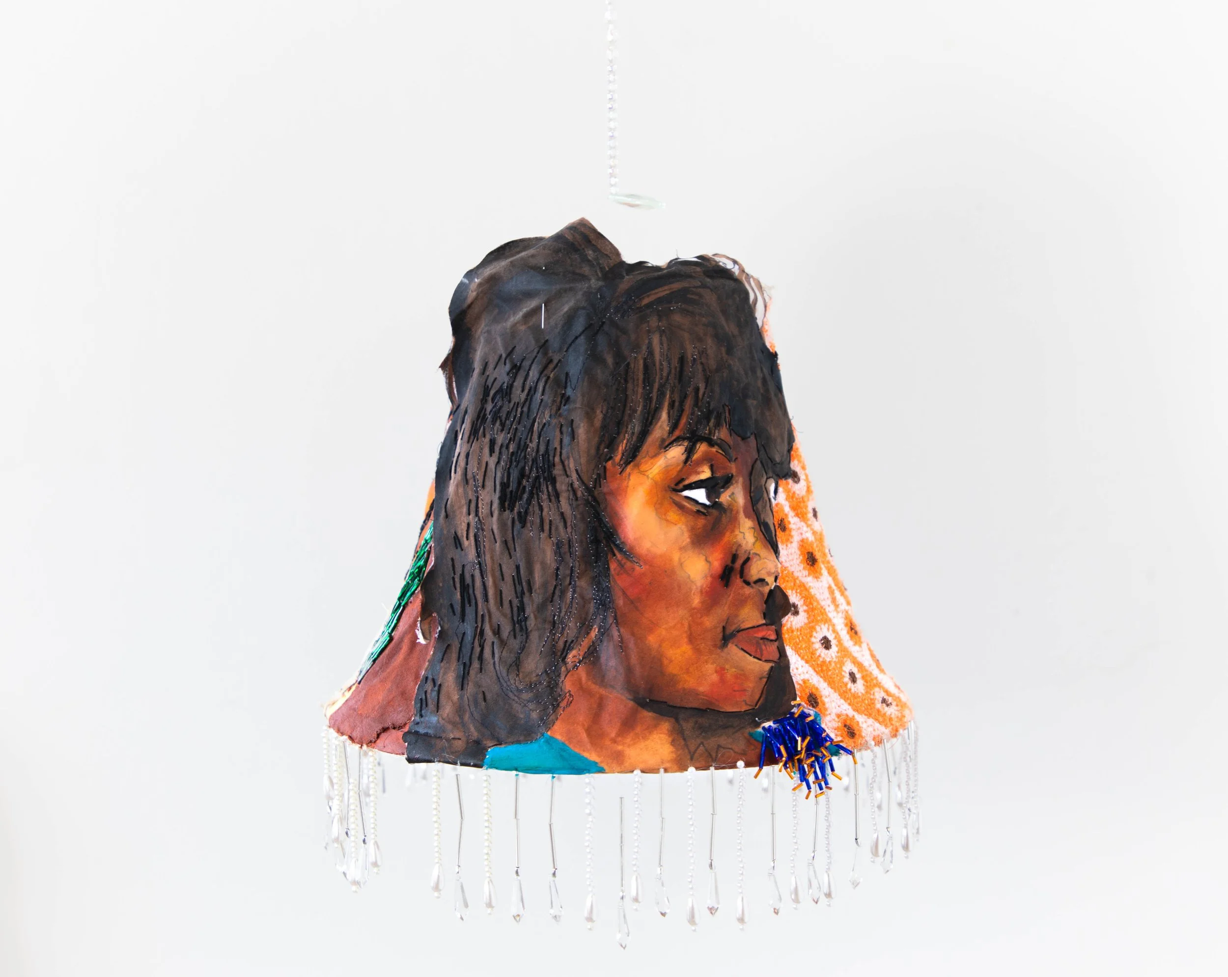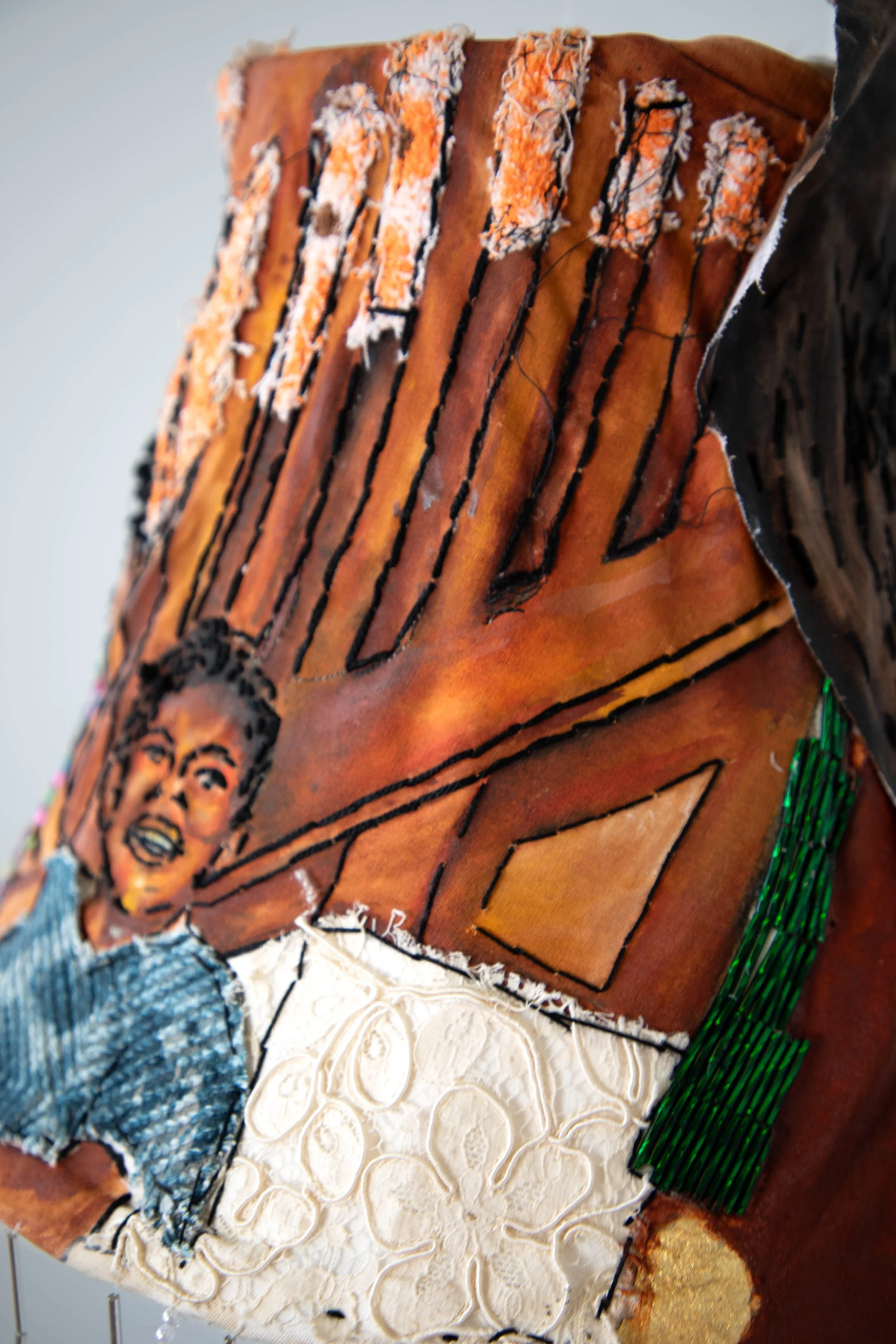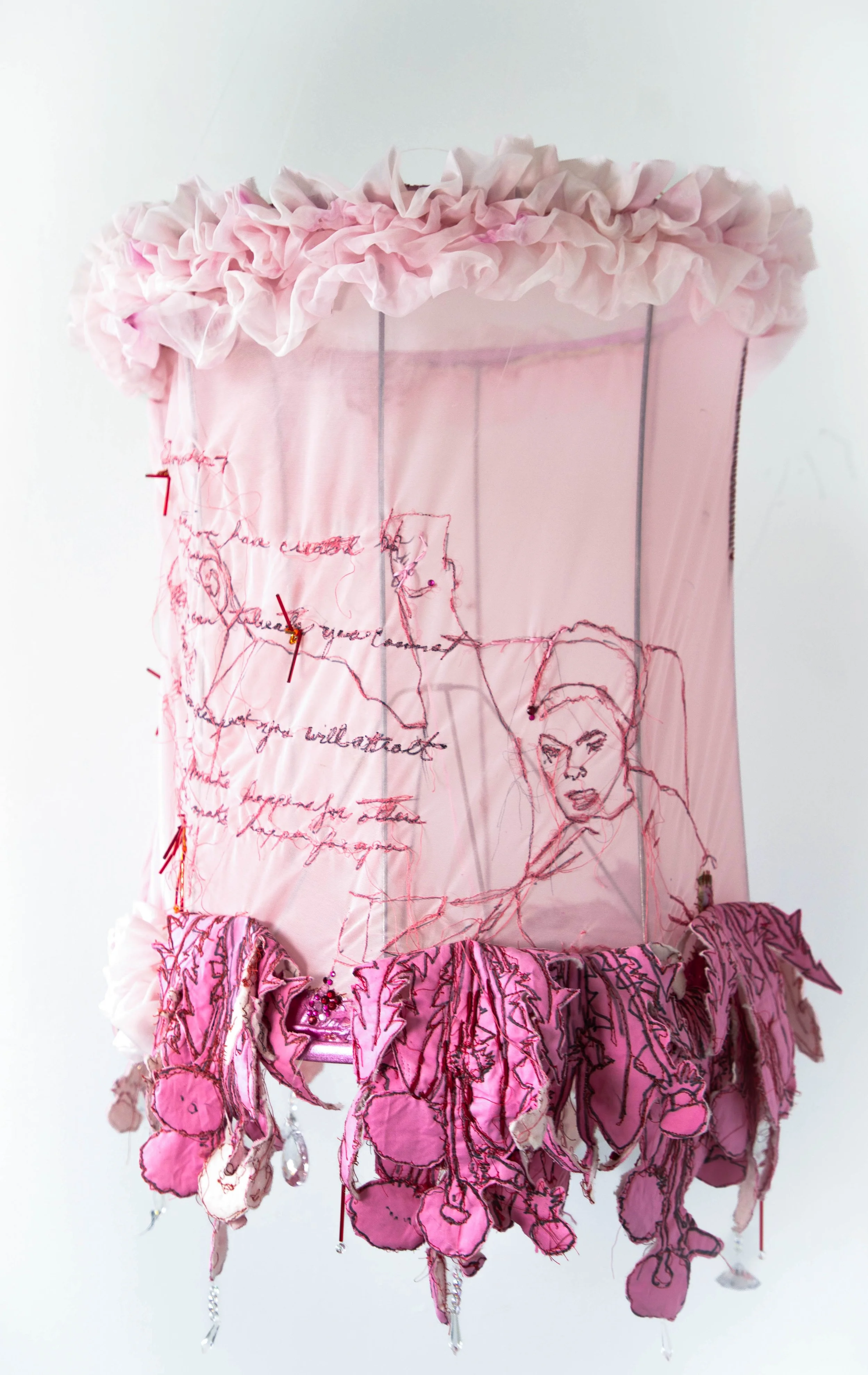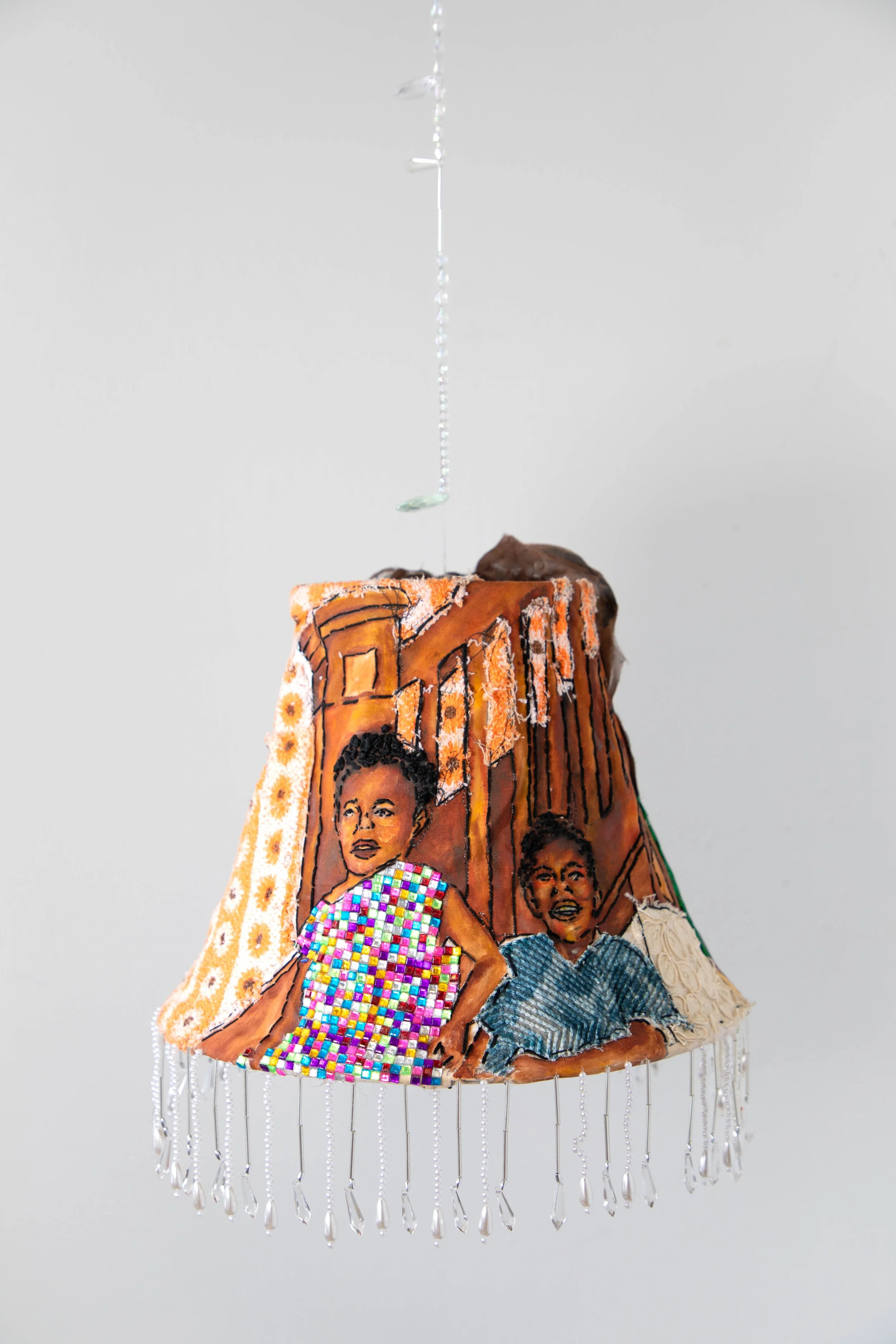Medium: Grandmothers 1960s lampshade, Acrylic Paint, Thread, 1940s Night gown, Cotton, Glass Beads.